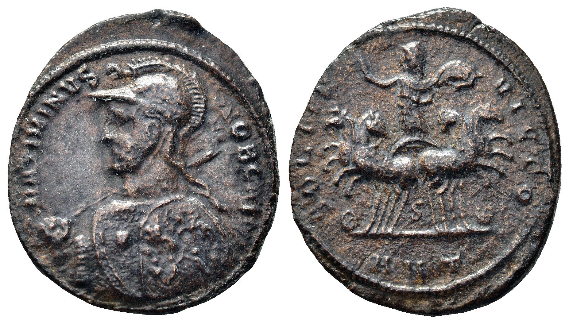 | Maximinus II A.D. 310 Ӕ follis 26mm 5.8g MAXIMINVS NOB CAES; bust l., helmeted with gryphon crest and cuirassed, spear over r. shoulder, shield decorated with two horsemen and four prisoners on l. arm. SOLI IN-VICTO; Sol, rad. r. raised, l. holding up globe, in facing quadriga; two horses turn l., and two right; in middle S. In ex. ANT RIC VI Antioch 145b |
