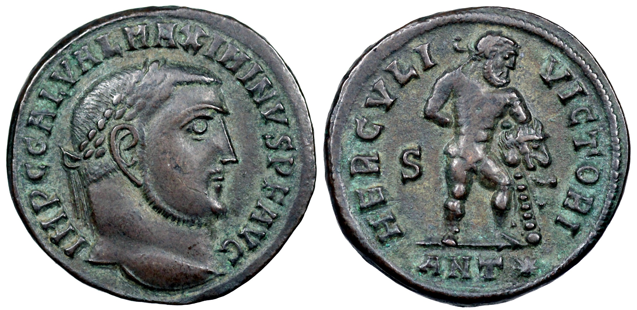 | Maximinus II A.D. 313 21mm 4.2g IMP C GAL VAL MAXIMINVS P F AVG; laureate head right. HERCVLI VICTORI; Hercules standing right, right hand behind back, left leaning on club covered by lion’s skin, S in left field. in exergue ANT✶ RIC VI Antioch 170b |