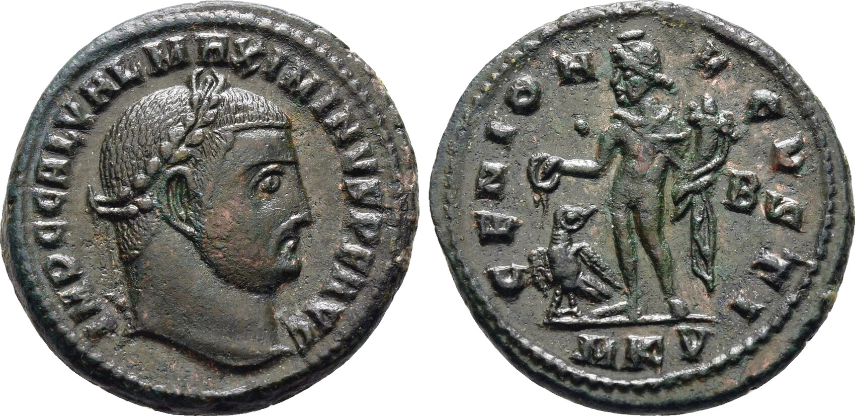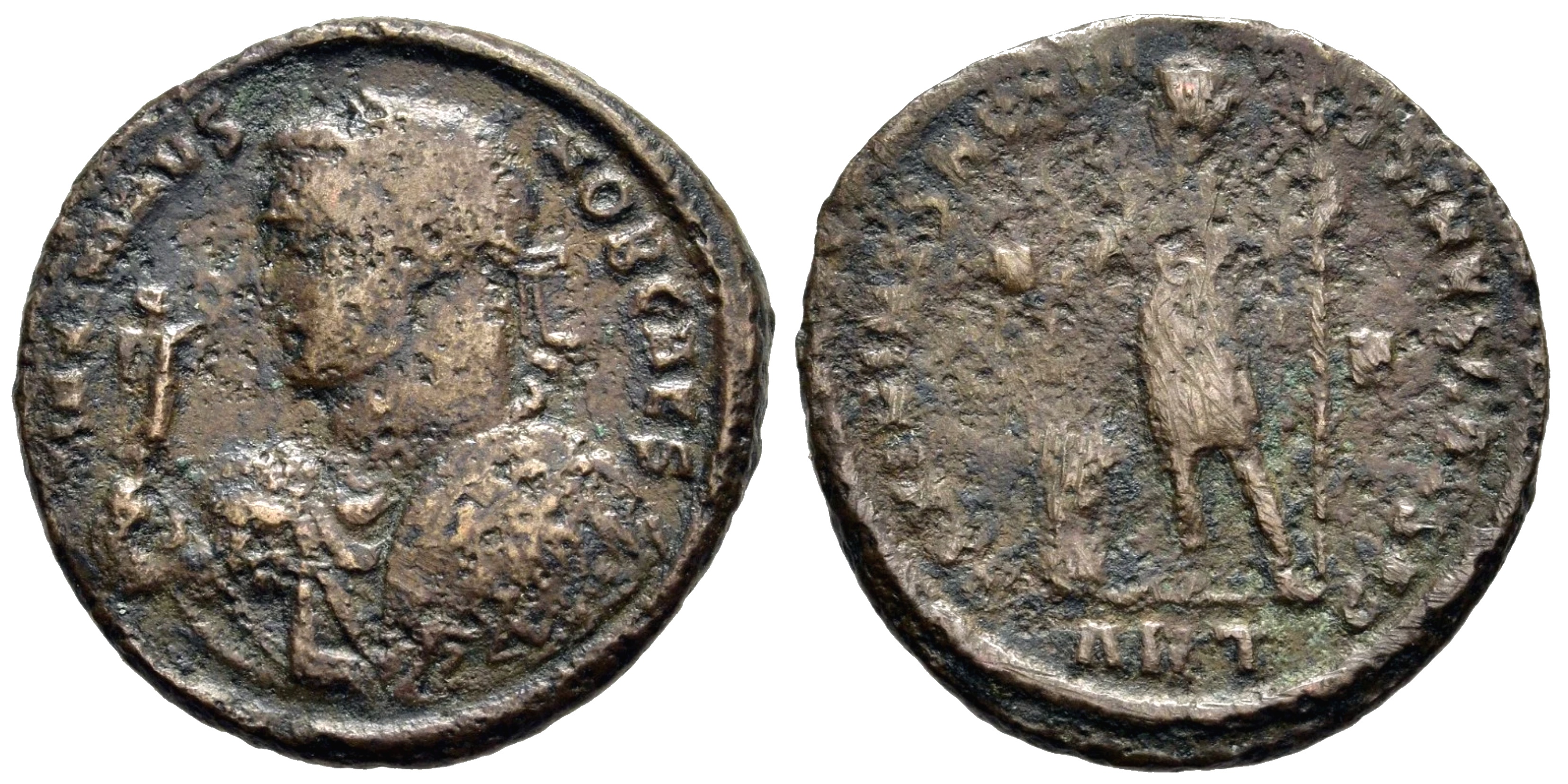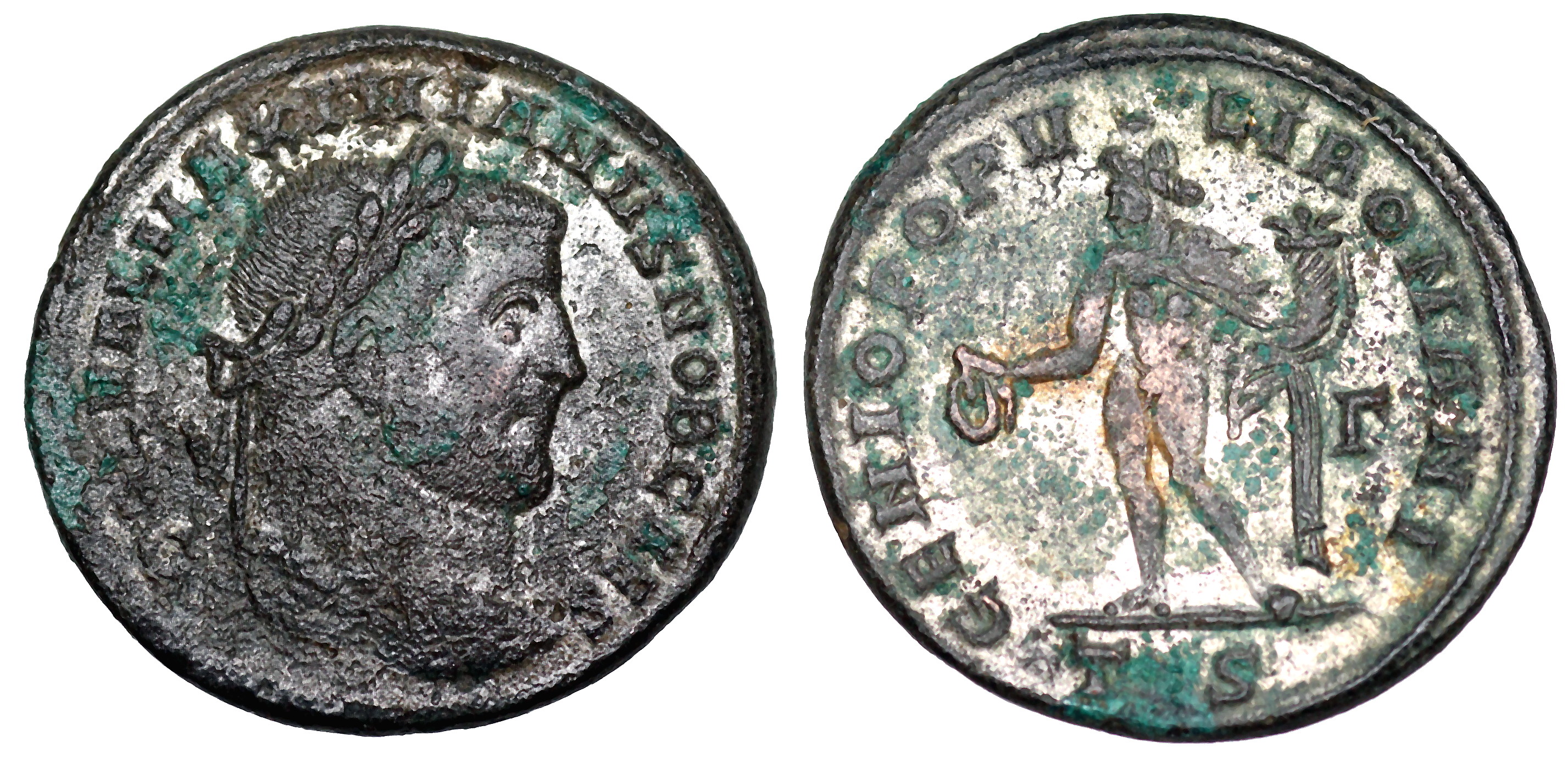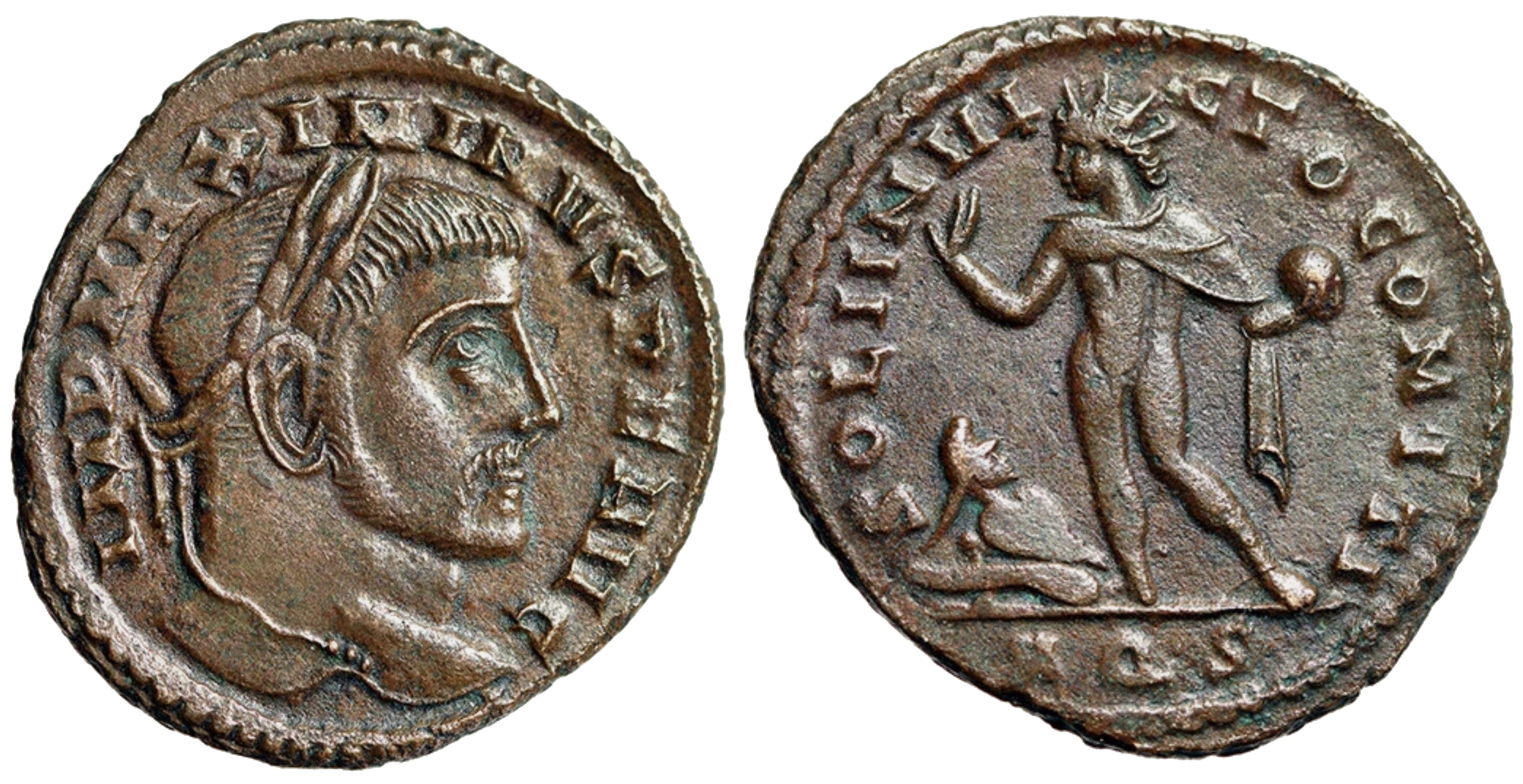 | Maximinus II A.D. 310 Ӕ follis 25mm 7.2g MAXIMINVS NOB CAES; laureate bust right, half-length, in imperial mantle, right hand raised. IOVIO PROPAGAT ORBIS TERRARVM; Maximinus, togate, holding victory on globe; in left field ς (retrograde); ✶over altar in right. In ex. ANT RIC VI Antioch 134 The reverse translates roughly as -- To the Jovian [Maximinus] expander of the whole world |