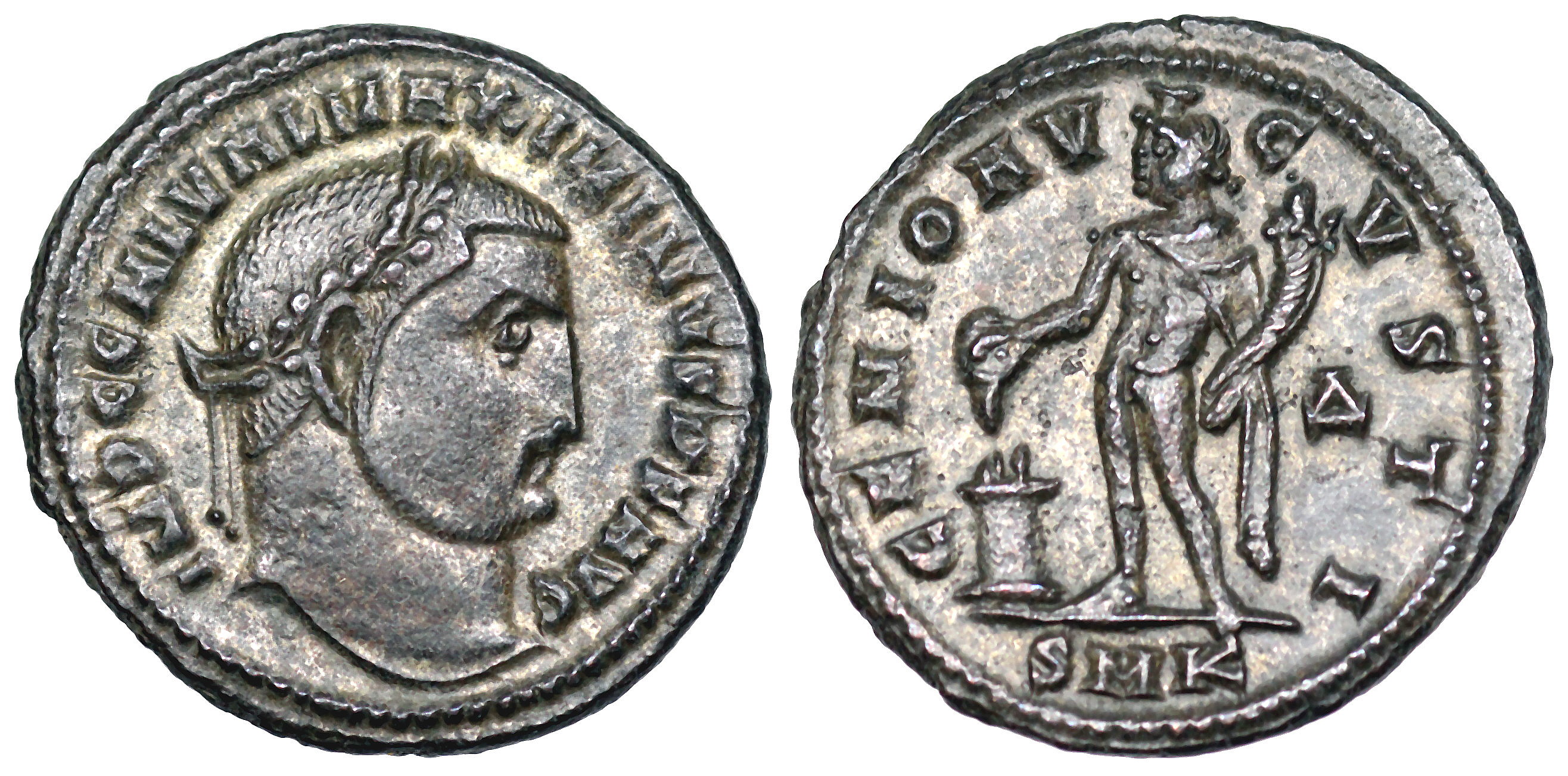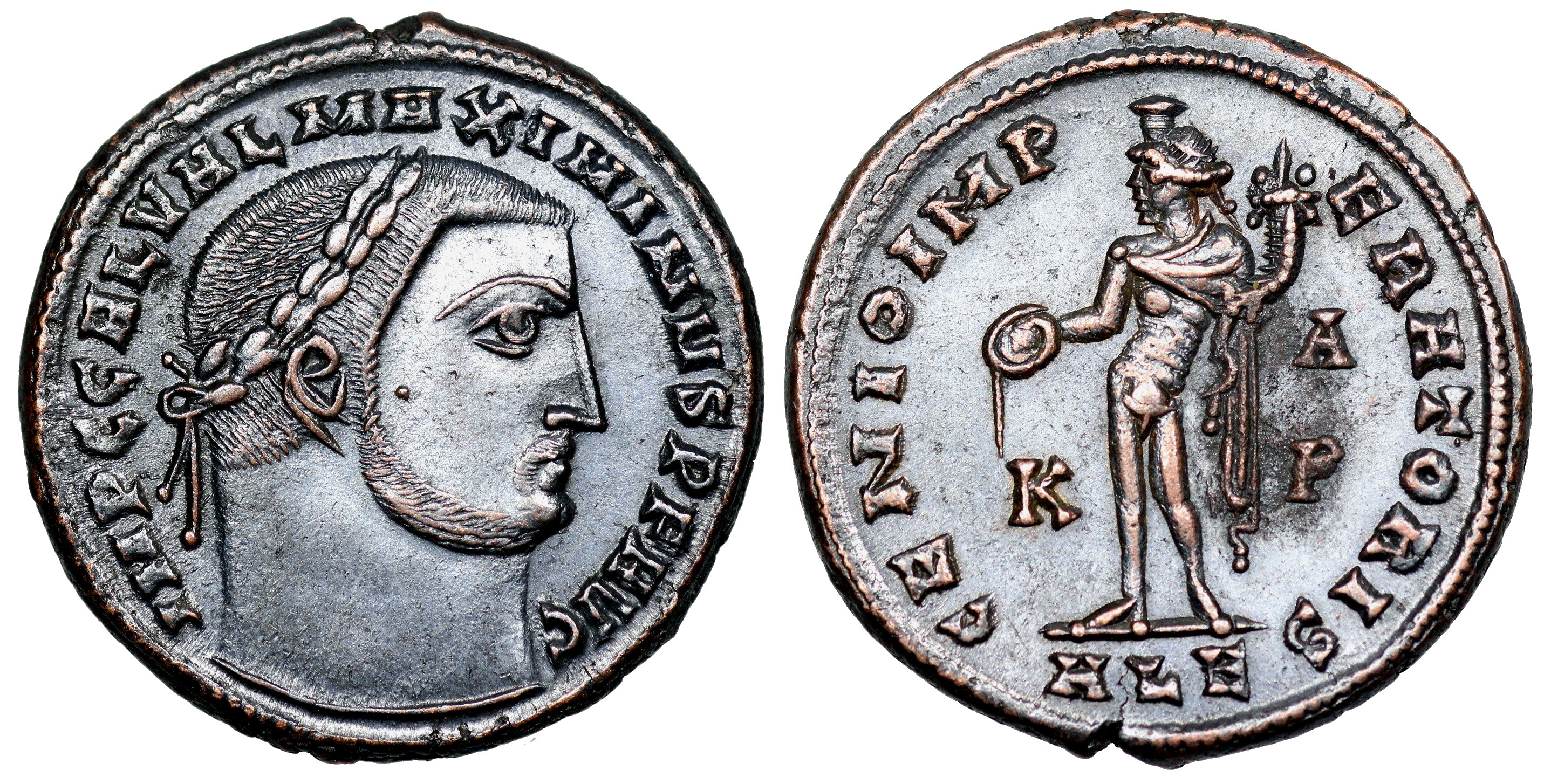 | Maximinus II A.D. 308- 310 25mm 7.0g IMP C GAL VAL MAXIMINVS P F AVG; laureate head right. GENIO IMPERATORIS; Genius standing left, holding patera & cornucopiae; K in left field, Δ over P in right. In ex. ALE RIC VI Alexandria 103, 105c, 107c No wreath ties; which is the difference in the RIC numbers-- divergent, parallel and rounded or pointed ends. |