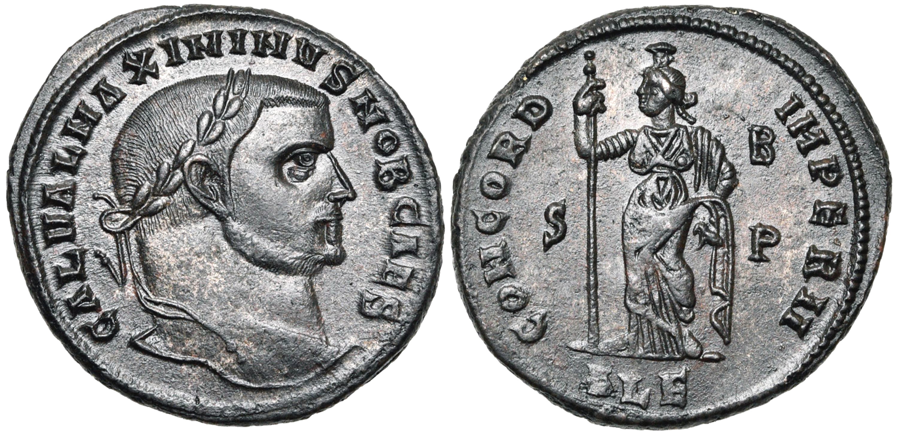 | Maximinus II A.D. 305-307 25x26mm 7.0gm GAL VAL MAXIMINVS NOB C; laureate head of right. CONCORDIA IMPERII; Concordia standing facing, head left, holding scepter; in right field VI. In ex. SISΓ RIC VI Siscia 173b sold |