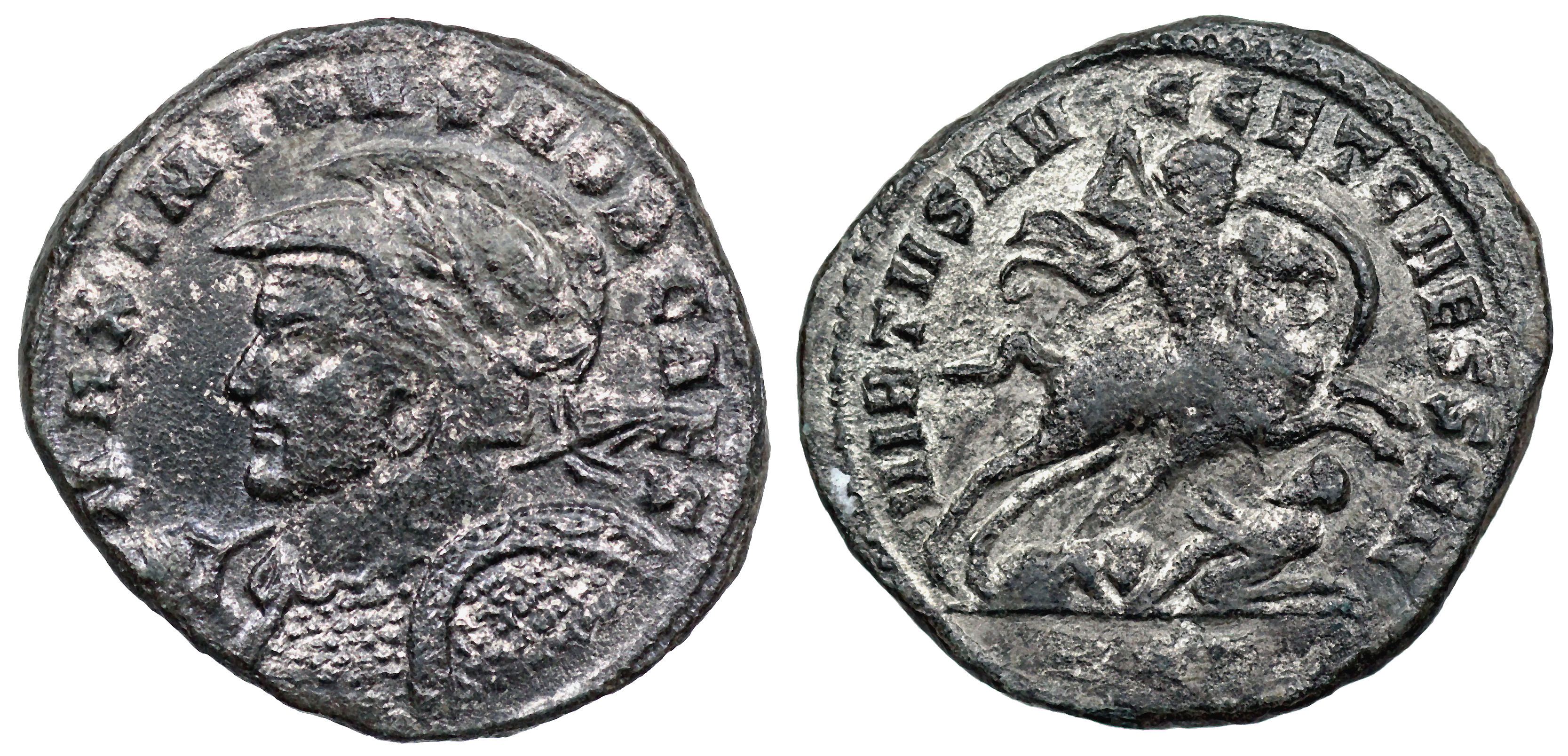 | Maximinus II A.D. 309- 310 26mm 6.4g MAXIMINVS NOB CAES; Helmeted and cuirassed bust left, holding spear over his right shoulder and shield decorated with two horsemen with Draco standards riding to left, four enemies below them; on cuirass, gorgoneion; on helmet, Sol standing facing in quadriga, raising his right hand in salute and holding globe in his left, around, stars and crescent, crest ending in griffin. VIRTVS EXERCITVS; Mars standing front, head to left, resting right hand on decorated shield and holding spear in left; in field to left, lighted altar; B in right field. In ex. ANT RIC VI Antioch 125 Antioch was likely his principal residence of Maximinus from 309- 311, so not surprising this special type was struck there. This type may also have referenced the campaign against the Sassanids (not only the martial bust, but also battle scene on shield) waged by Maximinus (late 309-early 310) and perhaps also his desire to be named Augustus; which may have happened during the same campaign-- “at the last general muster he had been saluted by his army under the title of Augustus.” (Lactantius XXXII) Galerius recognized him as Augustus (mid 310) but since the troops of Maximinus had already raised him up, this was probably just a formality. |