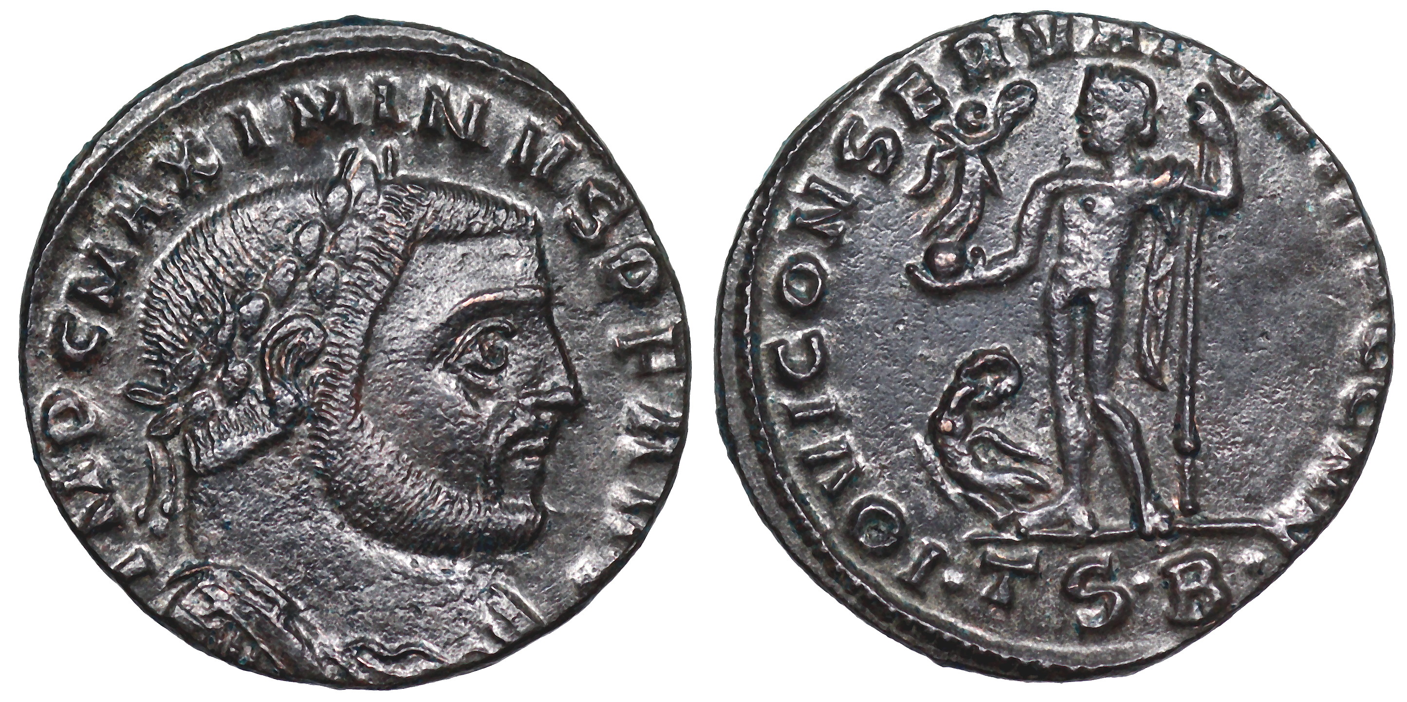 | Maximinus II A.D. 312- 313 22x23mm 3.9g IMP C MAXIMINVS P F AVG; laureate, draped and cuirassed bust right. IOVI CONSERVATORI AVGG N N; Jupiter standing left, right holding Victoriola, left leaning on sceptre, at feet left, an eagle with a wreath in its beak. In ex. •TS•B• RIC VI Thessalonica 61a |