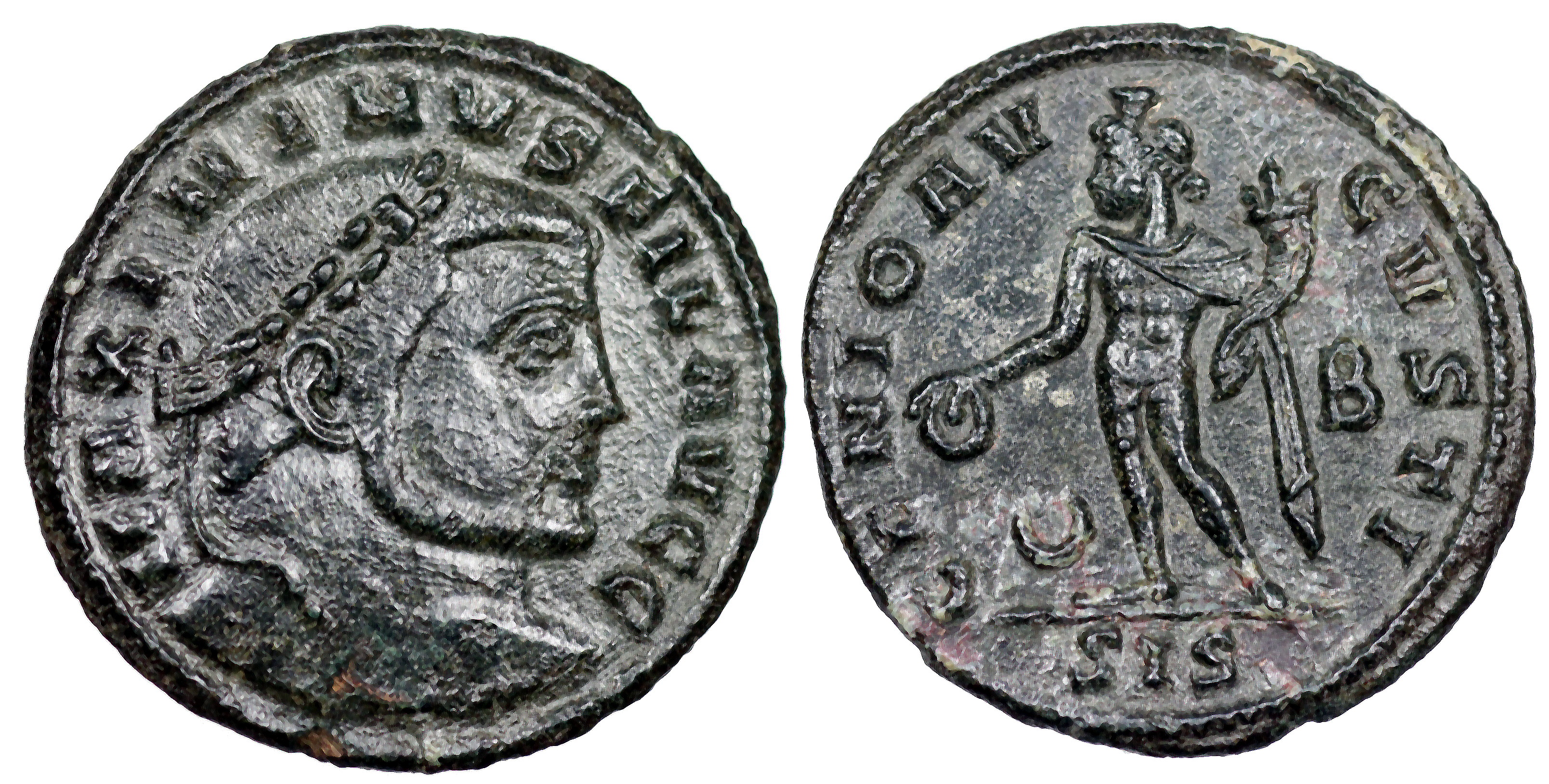 A.D. 312 Ӕ follis 20x21mm 5.0g IMP C GAL VAL MAXIMINVS PF AVG; laureate head right. VIRTVTI EXERCITVS; Mars advancing right, dragging captive, holding trophy and shield; in left field✶, in right I. In ex. ANT RIC VI Antioch 169b |